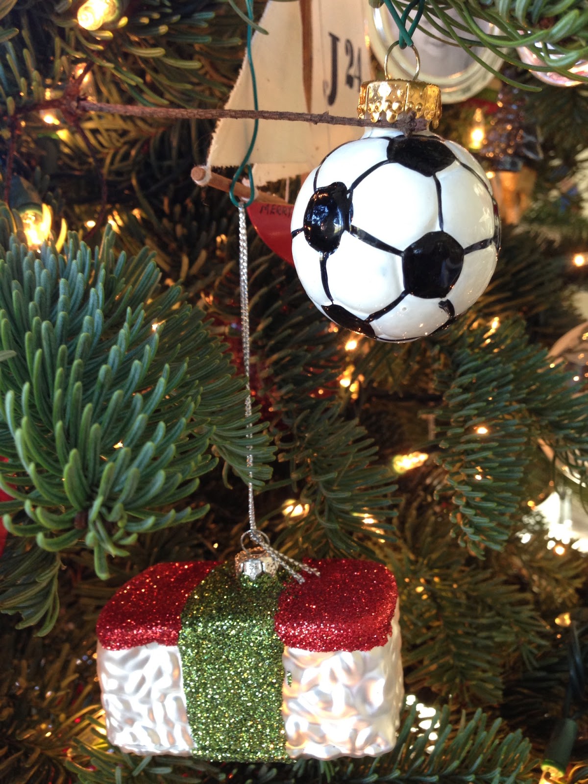 And there are the ornaments that are reflections of my boys….the soccer ball for Patch (and the endless soccer season that we live in) and the SPAM musabi for Will (yes, Will likes SPAM musabi as well as Hawaii where he loves to get them).  You can see the sail boat in the background….for the sailing season that lasts half the year in our house.